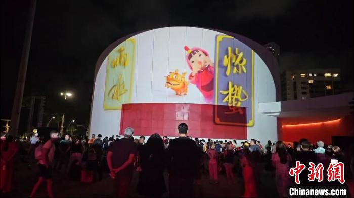 當(dāng)天晚上,多娜·琳杜公園內(nèi)劇院的外墻,投影出中國文化元素?zé)艄庑恪.嬅嬷?,十二個生肖福娃次第給觀眾拜年,中國傳統(tǒng)時令節(jié)氣習(xí)俗一一展演,格外吸睛。