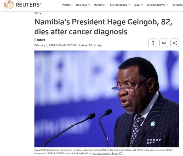 路透社稱,納米比亞共和國總統(tǒng)社交媒體賬號并未解釋該國總統(tǒng)去世的原因,但哈格·根哥布上月底曾表示,自己被診斷出患有癌癥,將前往美國治療。