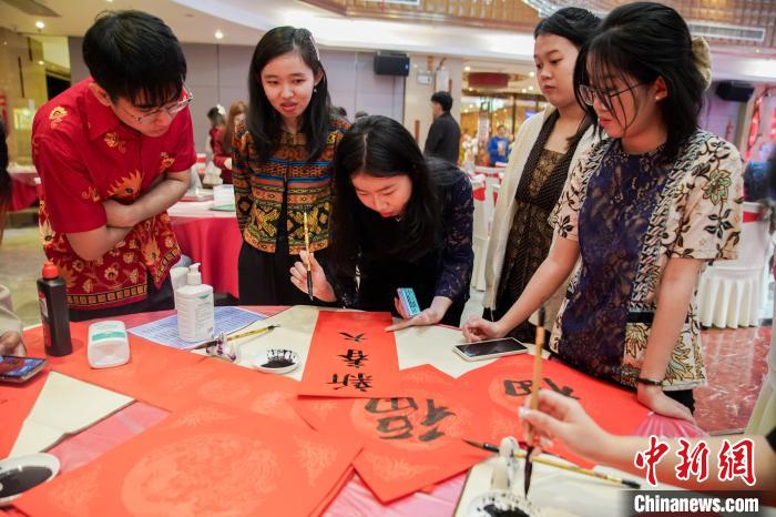 2月3日,廣西民族大學(xué)舉辦留學(xué)生春節(jié)團(tuán)拜會(huì)活動(dòng)。圖為留學(xué)生在寫春聯(lián)。陳冠言 攝