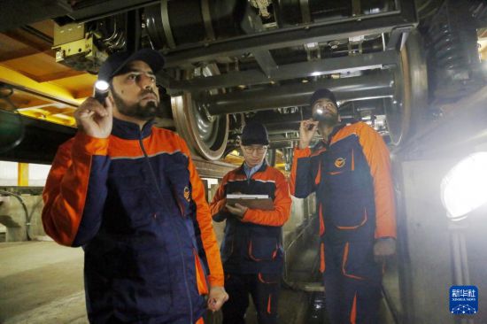 2月1日,在巴基斯坦拉合爾,中巴方員工在檢修橙線地鐵列車。新華社發(fā)(艾哈邁德·卡邁勒攝)