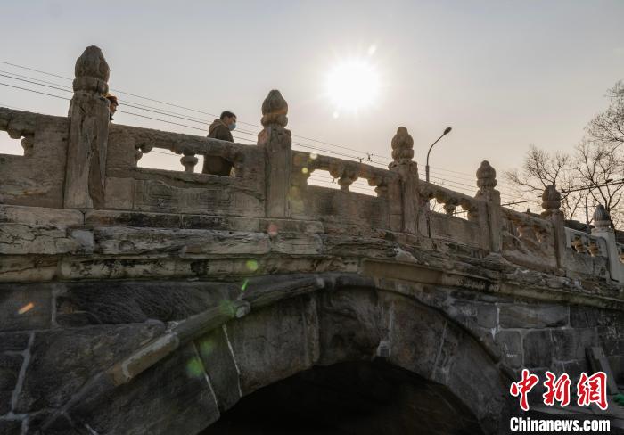 2023年2月22日,位于北京市西城區(qū)的“北京中軸線第一橋”——萬寧橋映襯在陽光之下。萬寧橋始建于元代,為單孔石拱橋,橫跨在什剎海前海東岸的玉河上,西鄰什剎海前海,是《北京中軸線保護(hù)管理規(guī)劃(2022年—2035年)》確定的遺產(chǎn)區(qū)要素之一。中新社記者侯宇攝