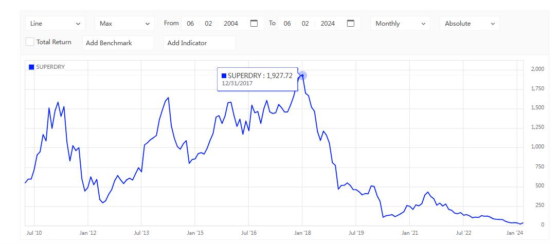 值得一提的是,倫敦證券交易所網(wǎng)站顯示,Superdry的股價(jià)曾在2017年年底達(dá)到過1927.72便士/股。