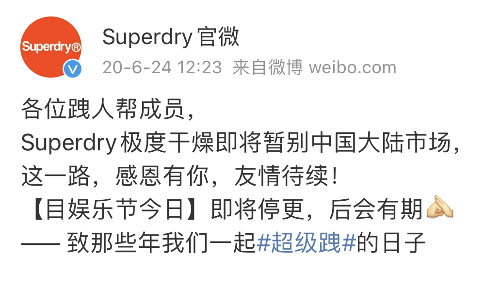 2020年6月,Superdry宣布,將暫別中國大陸市場(chǎng),并稱“致那些年我們一起超級(jí)跩的日子”。