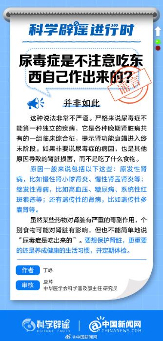 中新網(wǎng)2月7日電 近日有人稱:“中國(guó)尿毒癥透析患者已經(jīng)超過(guò)100萬(wàn)了,尿毒癥是不注意吃東西自己作出來(lái)的,要想不得尿毒癥,有些食物不能碰……”注意,這些說(shuō)法沒(méi)有科學(xué)依據(jù)!嚴(yán)格來(lái)說(shuō)尿毒癥并不能算一種獨(dú)立的疾病,它是各種晚期腎臟病共有的一組臨床綜合征,提示腎功能衰竭進(jìn)入終末階段。如果非要說(shuō)尿毒癥的病因的話,也是其他原因?qū)е碌哪I臟損害,而不是吃了什么食物。要想保護(hù)腎臟,更重要的還是養(yǎng)成健康的生活習(xí)慣,并定期體檢。(來(lái)源:@科學(xué)辟謠 中國(guó)新聞網(wǎng)微博)