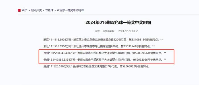 記者致電貴州省福利彩票發(fā)行中心,相關(guān)工作人員表示,在貴州的134注一等獎(jiǎng)中,133注為同一銷售網(wǎng)點(diǎn)銷售,由兩張彩票組成。銷售網(wǎng)點(diǎn)的地址為貴州安順市平壩區(qū)黎平大道堡墅小區(qū)8號(hào)門面,編號(hào)為第52032056號(hào)。