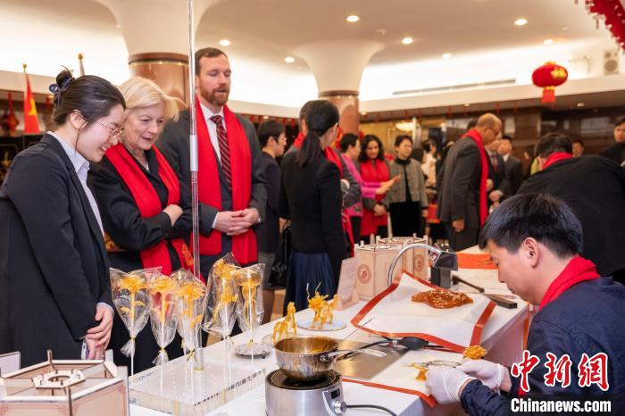 招待會上,來自浙江省的工藝美術(shù)大師和非遺傳承人精心準備了各具特色的中國非遺和年俗互動項目,來自美國西北大學(xué)的音樂家演唱了激情澎湃的《為祖國干杯》和熱鬧喜慶的《龍船調(diào)》。來賓們紛紛表示,期待新的一年繼續(xù)與中國攜手努力,建設(shè)更美好的世界。(完)