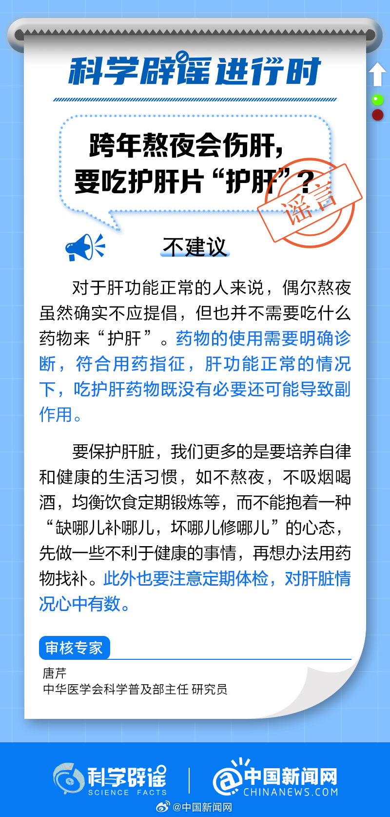 中新網2月10日電 對于肝功能正常的人來說,偶爾熬夜不需要吃什么藥物來“護肝”。藥物的使用需要明確診斷,符合用藥指征,肝功能正常的情況下,吃護肝藥物既沒有必要還可能導致副作用。要保護肝臟,我們更多的是要培養(yǎng)自律和健康的生活習慣,如不熬夜、不吸煙喝酒、均衡飲食、定期鍛煉等。(來源:@科學辟謠 中國新聞網微博)