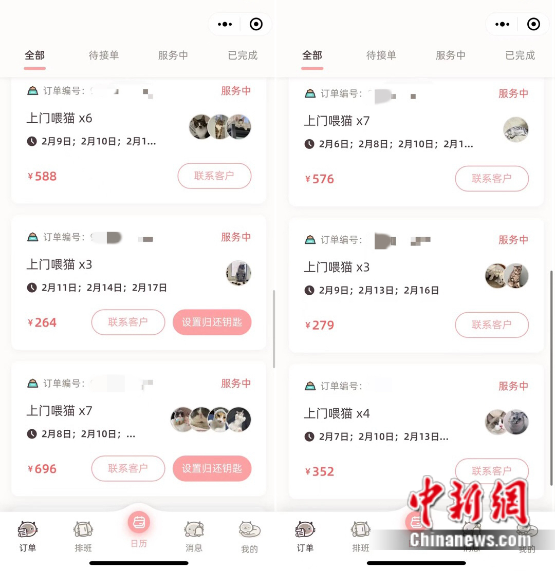 早在兩個月前,池女士就陸續(xù)接到了預(yù)約春節(jié)上門喂養(yǎng)的單子,到了1月底,由于訂單眾多,她不得不封單?!鞍创螖?shù)的話有超過150單了,好幾天都是一天20單。”按節(jié)假日平均80/次的價格來算,這個春節(jié)她將收入過萬。