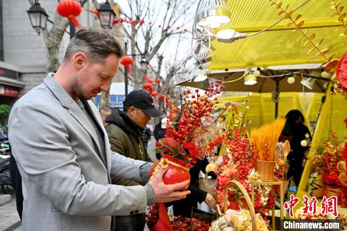 2月7日,李納德逛年貨街,選購年宵花。中新社記者 李嘉嫻 攝