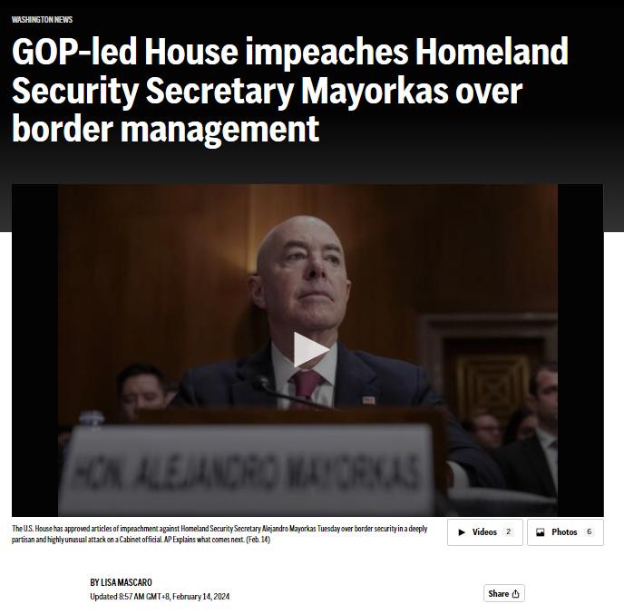 另據(jù)美國全國廣播公司(ABC)報道,國土安全部發(fā)言人和馬約卡斯紛紛指責,共和黨彈劾后者的指控“毫無根據(jù)”。