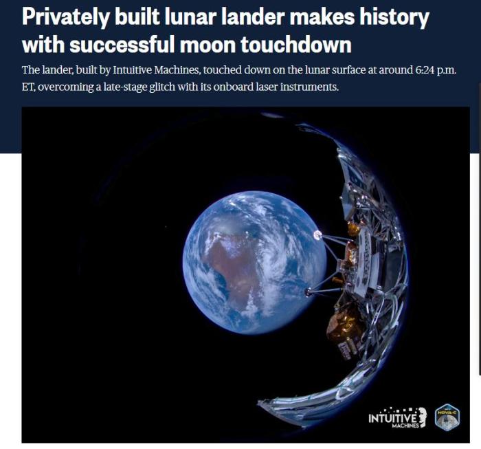據(jù)報(bào)道,由“直覺機(jī)器” 研發(fā)的著陸器于美東時(shí)間下午6點(diǎn)23分左右降落在月球表面。該著陸器是自1972年“阿波羅17號(hào)”任務(wù)以來(lái)第一艘登上月球的美國(guó)航天器。