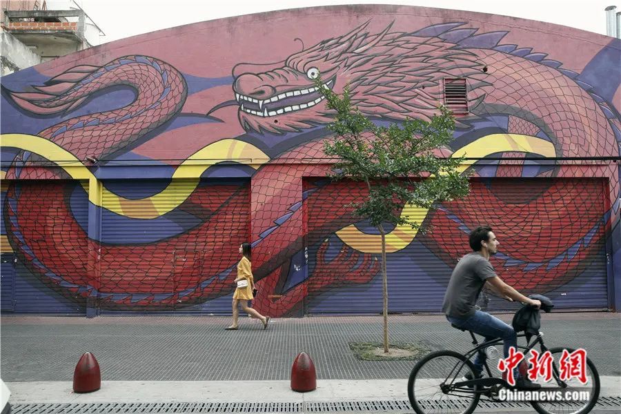 阿根廷首都布宜諾斯艾利斯“唐人街”上一家涂有巨龍圖案的店鋪。盛佳鵬 攝