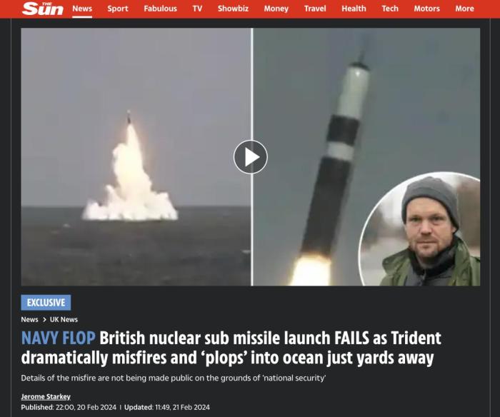 據(jù)《太陽報(bào)》報(bào)道,英國皇家海軍“先鋒”號(hào)核潛艇于1月30日在美國佛羅里達(dá)州附近海域,進(jìn)行了一次“三叉戟II”型導(dǎo)彈發(fā)射演習(xí),然而發(fā)射的導(dǎo)彈第一級(jí)推進(jìn)器并未按計(jì)劃點(diǎn)燃,導(dǎo)致這枚重達(dá)58噸的導(dǎo)彈(裝有假彈頭)掉進(jìn)海中。
