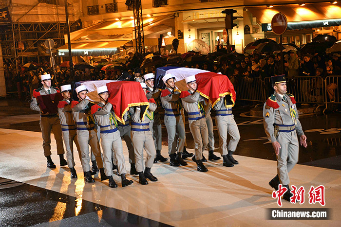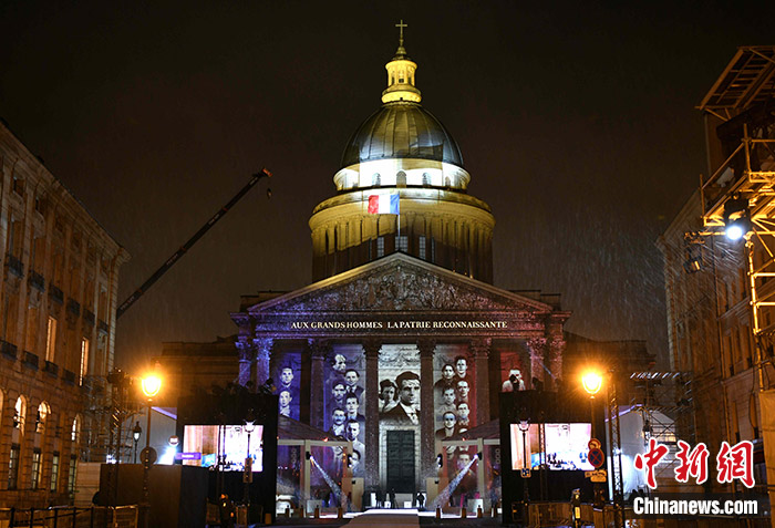 法國(guó)官方當(dāng)晚舉行了莊嚴(yán)的靈柩遷葬儀式。記者在現(xiàn)場(chǎng)看到,盡管天氣惡劣,風(fēng)雨交加,仍有眾多民眾冒雨守候在通往先賢祠的道路兩旁觀看儀式。馬努尚夫婦和抵抗納粹小組成員的照片被投射到先賢祠的正門(mén)上。