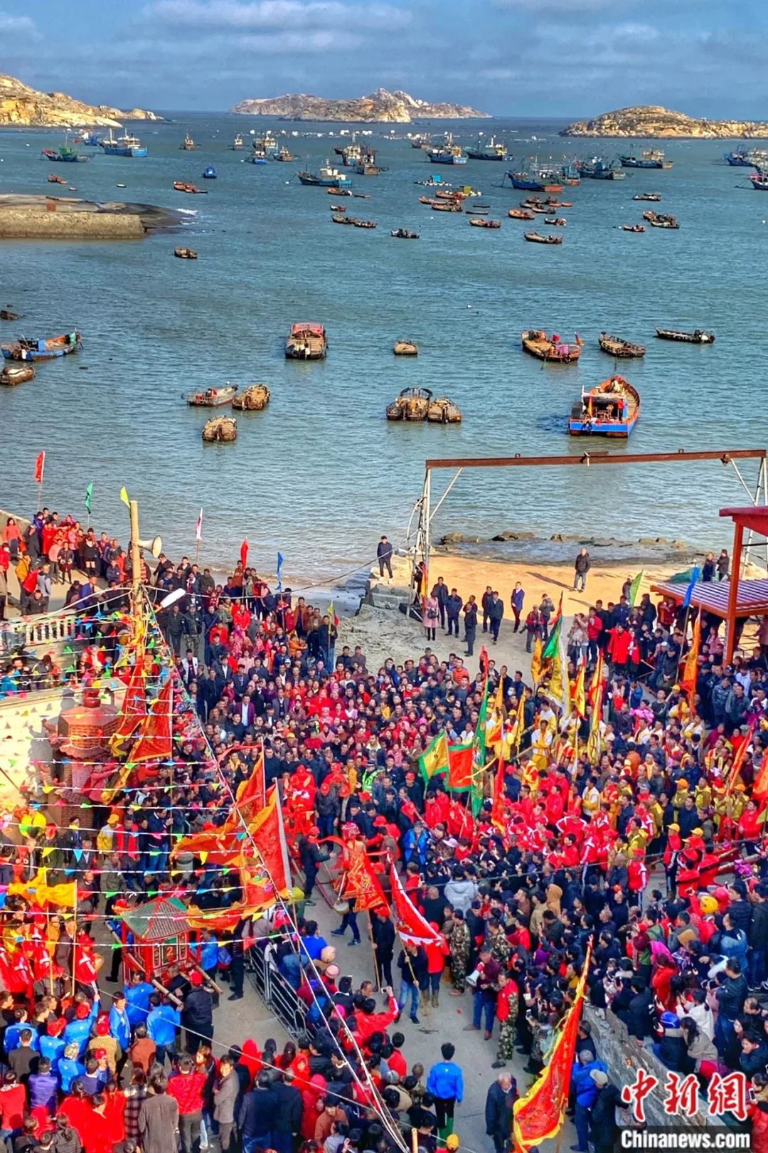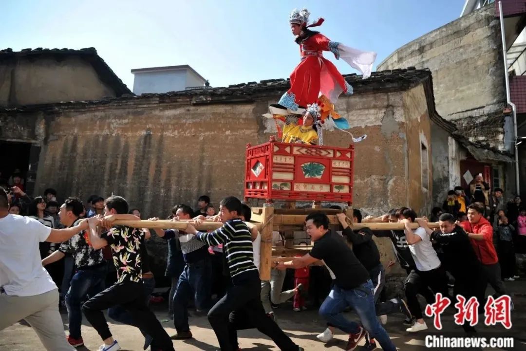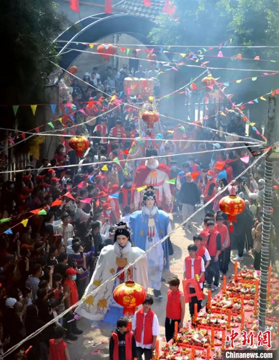 每年正月初十及正月二十六,潭頭鎮(zhèn)厚福村都會舉行傳統(tǒng)游神民俗活動,至今已有400多年的歷史。圖為傳統(tǒng)游神民俗活動中的巡游隊(duì)伍簇?fù)碇ι駥⒌娜俗呓执?。中新社記?呂明 攝