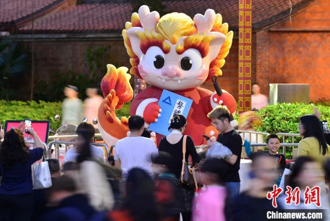 “龍?jiān)亍彼囆g(shù)主題裝置亮相福州上下杭?xì)v史文化街區(qū),活潑的造型與古厝形成鮮明對比。中新社記者 呂明 攝