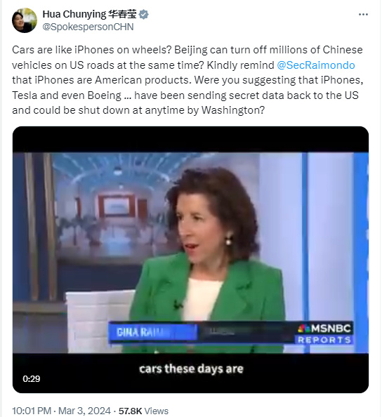 3月3日,華春瑩在社交媒體上發(fā)文回應美方這番言論,“汽車就像是裝了輪子的iPhone(蘋果手機)?北京能讓美國道路上的數百萬中國汽車同時熄火?友好提醒一下,iPhone是美國產品。你是不是在暗示iPhone、特斯拉甚至波音……一直在將機密數據傳送回美國,隨時可能被華盛頓關停?”