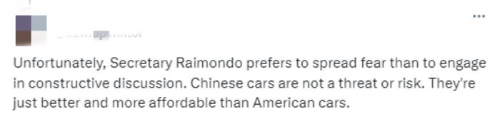 一名外國網友表示,雷蒙多喜歡“散布恐懼,而非進行建設性的討論”,而“中國制造的汽車比美國汽車更好、更便宜”。