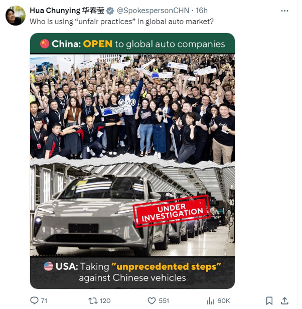 華春瑩還發(fā)布了一張圖,標明中國和美國在汽車領域的做法并寫道,“是誰在全球汽車市場采取‘不公平的做法’?”