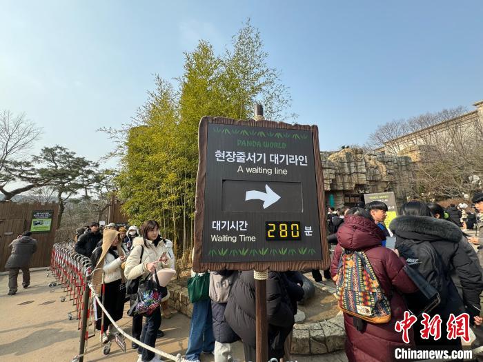 3月3日早上8時(shí)許,中新社記者來到位于韓國(guó)京畿道龍仁市的三星愛寶樂園,此時(shí)距離開園時(shí)間10時(shí)尚早,但正門外已排起百米長(zhǎng)隊(duì),大批民眾等待入園與大熊貓“福寶”告別。