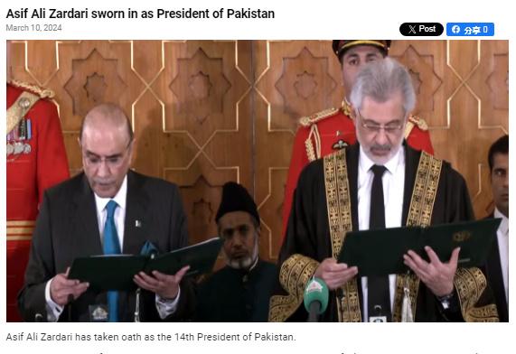 報(bào)道稱,扎爾達(dá)里曾是“巴基斯坦第一位民選總統(tǒng)”,這次是他第二次當(dāng)選巴基斯坦總統(tǒng)。