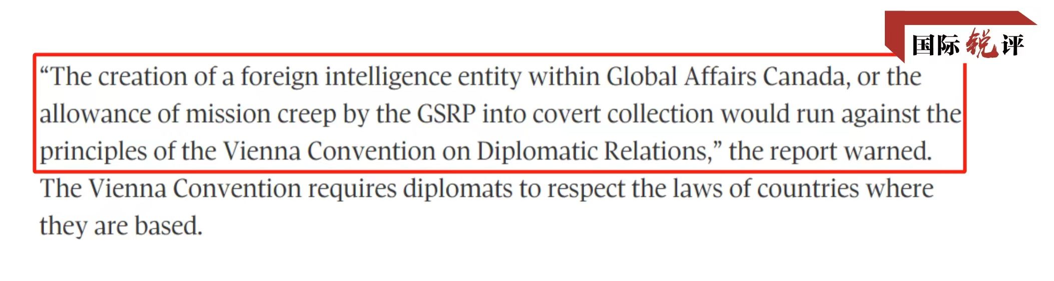 這里不得不提到一個(gè)項(xiàng)目——加拿大外交部“全球安全報(bào)告項(xiàng)目”(GSRP)。它負(fù)責(zé)派遣外交官在熱點(diǎn)地區(qū)收集相關(guān)安全信息,康明凱曾是該項(xiàng)目工作人員。加拿大國家安全與情報(bào)審查局去年12月發(fā)布的一份審查報(bào)告顯示,GSRP的工作內(nèi)容與加拿大安全情報(bào)局的部分海外任務(wù)有重疊,可能讓本國官員面臨風(fēng)險(xiǎn),也違反了國際外交公約。