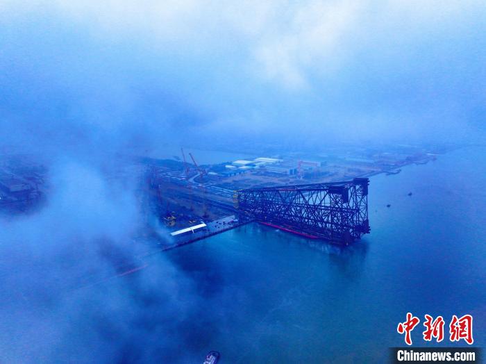 3月12日,亞洲第一深水導管架“海基二號”在廣東珠海建造完工。這是“?;枴睂Ч芗苎b船后全景。(中國海油供圖)