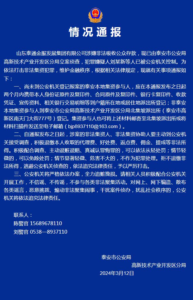 中新網(wǎng)3月13日電 山東泰安高新警方12日在官方微信公眾號(hào)發(fā)布山東泰通金服發(fā)展集團(tuán)有限公司涉嫌非法吸收公眾存款的情況通報(bào),目前該案件已由泰安市公安局高新技術(shù)產(chǎn)業(yè)開發(fā)區(qū)分局立案?jìng)刹椋缸锵右扇藙⒛承碌热艘驯还矙C(jī)關(guān)控制。為依法打擊非法集資犯罪,維護(hù)金融秩序,根據(jù)相關(guān)法律規(guī)定,現(xiàn)就有關(guān)事項(xiàng)通報(bào)如下: