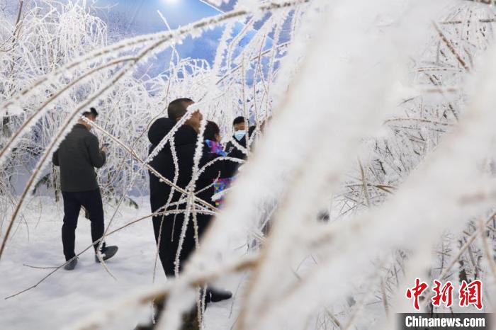 記者看到,在室內(nèi)凝結(jié)的冰晶顆粒較大,更像是水晶。龐培林說,冰晶凝結(jié)的厚度,達到了五星霧凇的標準。