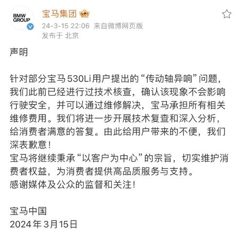 當(dāng)晚,寶馬集團也發(fā)布聲明稱,“針對部分寶馬530Li用戶提出的‘傳動軸異響’問題,我們此前已經(jīng)進行過技術(shù)核查,確認該現(xiàn)象不會影響行駛安全,并可以通過維修解決,寶馬承擔(dān)所有相關(guān)維修費用。我們將進一步開展技術(shù)復(fù)查和深入分析,給消費者滿意的答復(fù)。由此給用戶帶來的不便,我們深表歉意!”