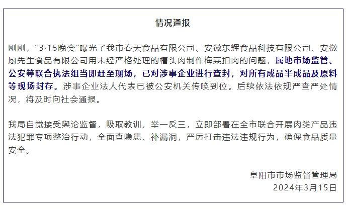 涉事企業(yè)所在的阜陽市市場監(jiān)督管理局當(dāng)晚發(fā)布情況通報稱,屬地市場監(jiān)管、公安等聯(lián)合執(zhí)法組當(dāng)即趕至現(xiàn)場,已對涉事企業(yè)進行查封,對所有成品半成品及原料等現(xiàn)場封存。涉事企業(yè)法人代表已被公安機關(guān)傳喚到位。后續(xù)依法依規(guī)嚴(yán)查嚴(yán)處情況,將及時向社會通報。