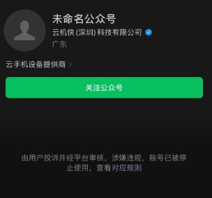 涉及主板機黑灰產(chǎn)業(yè)鏈的云機俠(深圳)科技有限公司,其微信公眾號顯示涉嫌違規(guī),賬號已被停止使用;其短視頻賬號已被相關(guān)平臺封禁;該公司官網(wǎng)目前也不能打開。