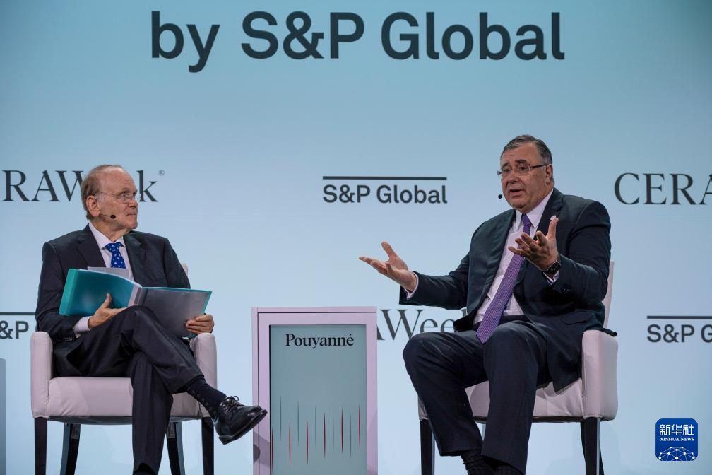 3月18日,法國道達爾能源首席執(zhí)行官帕特里克·普亞納(右)在美國休斯敦舉行的能源界高端會議“劍橋能源周”上分享觀點。新華社發(fā)(陳晨攝)