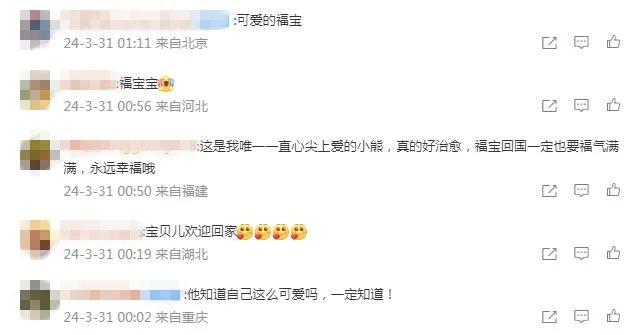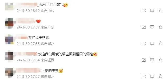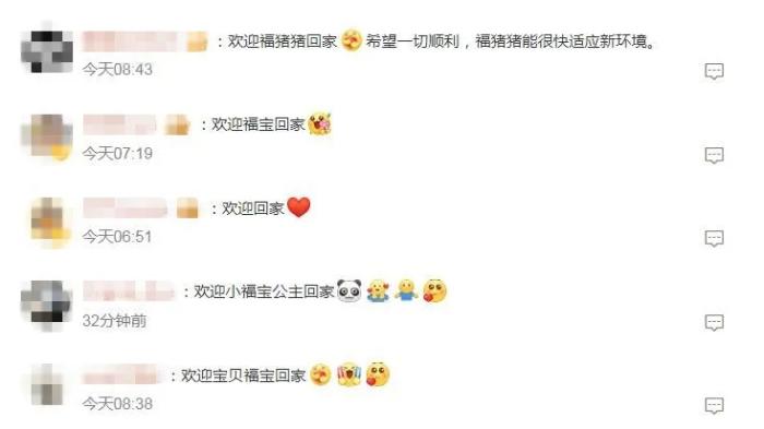 有網(wǎng)友寫(xiě)道,祝愿“福寶”一切順利,“能很快適應(yīng)新環(huán)境”。還有網(wǎng)友表示,“福寶回國(guó)后一定也要福氣滿(mǎn)滿(mǎn),永遠(yuǎn)幸福哦!”