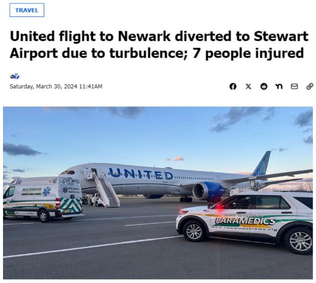 據(jù)報(bào)道,執(zhí)飛這一航班的機(jī)型為波音787,原計(jì)劃從特拉維夫飛往新澤西州紐瓦克國(guó)際機(jī)場(chǎng),機(jī)上有300多名乘客和機(jī)組人員。當(dāng)天下午約6:45,由于準(zhǔn)備降落時(shí)突遇“大風(fēng)和湍急氣流”,飛機(jī)改道飛往紐約斯圖爾特國(guó)際機(jī)場(chǎng)。