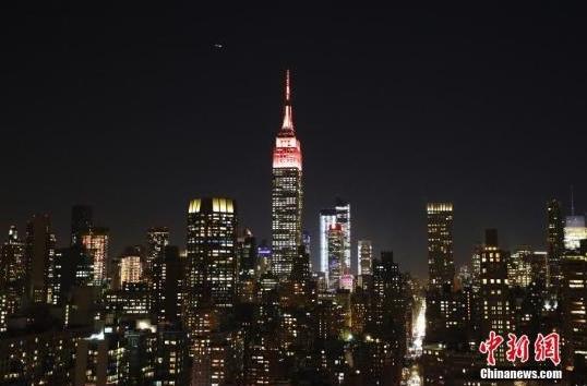 資料圖:美國紐約帝國大廈(中)亮燈。中新社記者 廖攀 攝