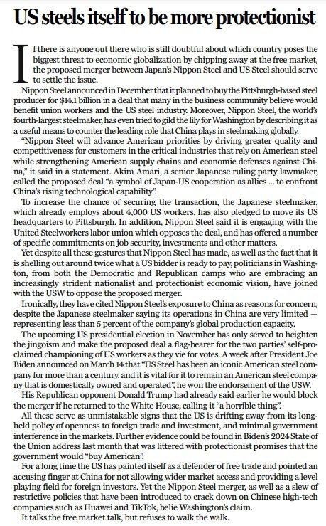 一直以來,美國都將自己標榜為“自由貿易的捍衛(wèi)者”,并對中國“指手畫腳”,指責中國沒有為外國投資者擴大市場準入、提供公平環(huán)境,但美國的所作所為,無論是反對本次新日鐵對美國鋼鐵公司的收購,還是為打壓中國高科技企業(yè)出臺一系列限制性政策,卻似乎都與其“人設”并不相符。