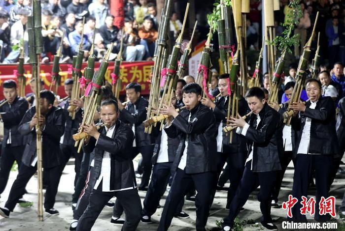 圖為4月4日清明節(jié),廣西三江侗族自治縣獨(dú)峒鎮(zhèn)10余支蘆笙隊(duì)齊聚一堂,以蘆笙踩堂、蘆笙比響等形式,展示侗鄉(xiāng)多彩風(fēng)情。龔普康攝