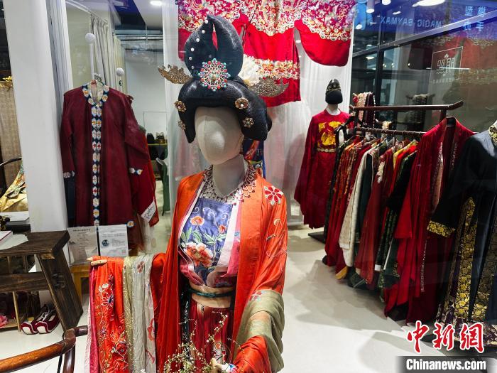 上海明熙傳統(tǒng)漢服禮服館內(nèi),擺放著唐代、明代、宋代等各個朝代,不同款式的漢服。楊海燕 攝