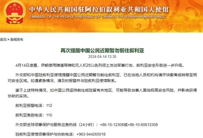 使館消息稱,4月14日凌晨,伊朗使用彈道導(dǎo)彈和無人機對以色列領(lǐng)土發(fā)動軍事打擊,敘利亞安全形勢進一步升級。