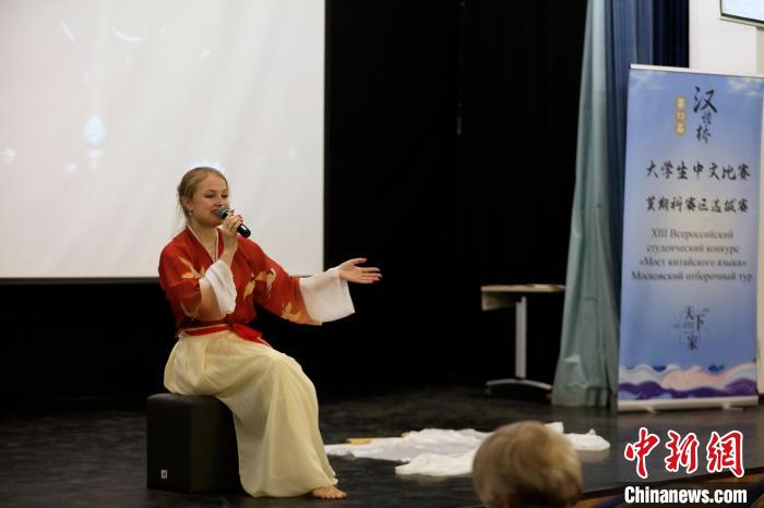 4月12日,第十三屆全俄“漢語橋”大學生中文比賽莫斯科賽區(qū)選拔賽在莫斯科國立語言大學舉行。圖為參賽選手在“中華文化技能”比賽環(huán)節(jié)。(中新網(wǎng)記者 田冰 攝)