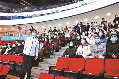 在現(xiàn)場,陳大鵬通過“由內(nèi)及外”“由下至上”的方式,將場館的競賽層、觀眾層、包廂層等流線以及各點位進行了詳細的講解,并以“你需要知道的25件事”為主題,為志愿者們講解了作為場館工作人員必須遵守的各項規(guī)章制度?!斑@25件事包括志愿者在場館工作的方方面面,既有場館日常管理、防疫規(guī)定,又有志愿者工作期間個人生活及行為規(guī)范、工作紀律和文明禮儀等。”陳大鵬說。