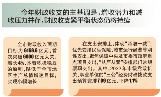 在財政收支依然嚴峻的情況下,“緊平衡”態(tài)勢也呈現(xiàn)出與以往財政收入零增長、負增長不同的態(tài)勢。吳素芳介紹,2022年的“緊平衡”,主要體現(xiàn)為收入回歸常態(tài)運行,但各領(lǐng)域資金需求快速增長。財政部門要堅決貫徹落實中央經(jīng)濟工作會提出的“積極的財政政策要提升效能,更加注重精準、可持續(xù)”工作要求,通過調(diào)結(jié)構(gòu)、盤存量、抓統(tǒng)籌、保重點等方式做好保障。在支出安排上,體現(xiàn)“兩增一減”:優(yōu)先安排民生保障、城市運行經(jīng)費等剛性支出,聚焦保障中央及市委市政府重點項目支出,“從嚴從緊”安排部門常規(guī)履職支出。其中,2022年市級黨政機關(guān)、事業(yè)單位的“三公”經(jīng)費財政撥款支出預(yù)算安排7.09億元,下降1.1%。