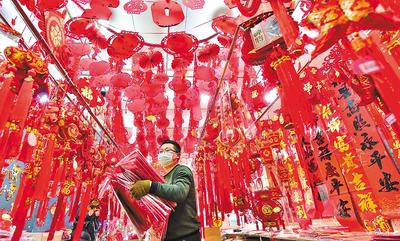 1月8日,石家莊市南三條市場(chǎng)的商戶(hù)在忙著準(zhǔn)備年貨。隨著農(nóng)歷新年的臨近,春聯(lián)、福字、燈籠、虎年生肖飾品的銷(xiāo)售行情逐日升溫。 河北日?qǐng)?bào)通訊員 張曉峰攝