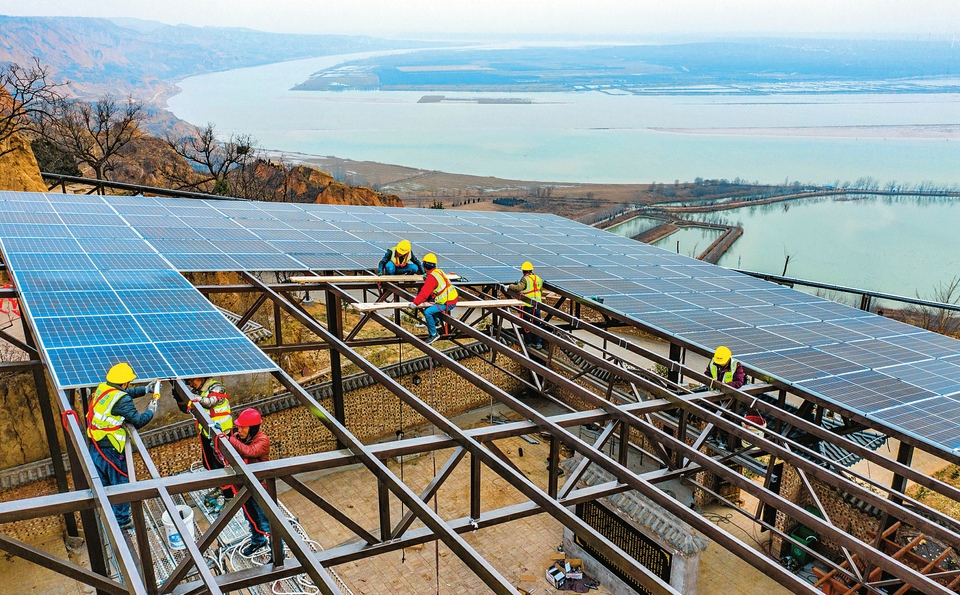 1月7日,施工人員在芮城縣陌南鎮(zhèn)莊上村安裝光伏板。近年來,該村因地制宜,大力發(fā)展綠色清潔新能源,目前全村72戶已用上“光儲(chǔ)直柔”村級(jí)發(fā)電系統(tǒng)。項(xiàng)目全部建成后,不僅可以滿足全村生產(chǎn)生活用電,每年還可向外配送170萬千瓦時(shí)清潔電力。(薛俊攝)