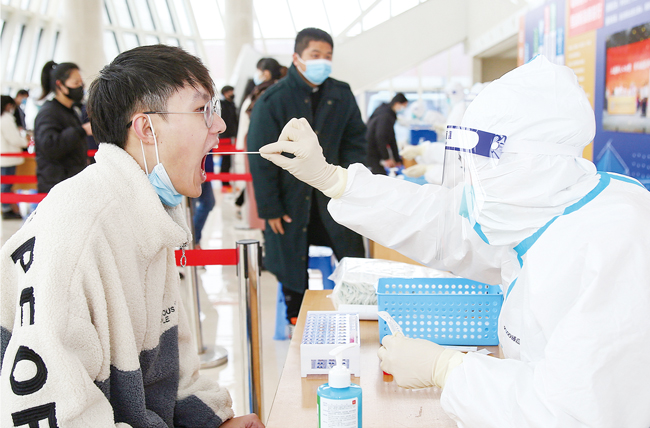 連日來,金華東陽醫(yī)護(hù)人員陸續(xù)來到一些學(xué)校給學(xué)生做核酸檢測(cè),讓他們不出校門就拿到核酸檢測(cè)報(bào)告。大學(xué)生寒假返鄉(xiāng)高峰期來臨,面對(duì)復(fù)雜的疫情防控形勢(shì),不少地方要求必須持核酸檢測(cè)陰性報(bào)告才能返鄉(xiāng)。(李建林)