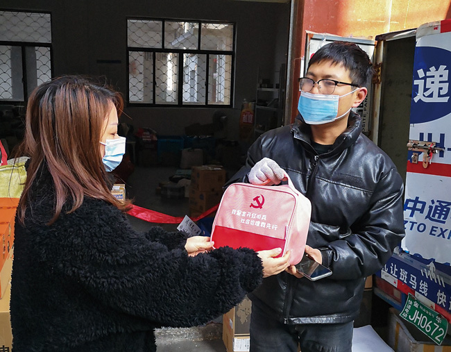 1月12日,金華開發(fā)區(qū)江南街道金錢寺社區(qū)給快遞小哥贈送裝有口罩、酒精、消毒液等物資的“防疫禮包”,讓快遞小哥做好自身防護(hù)。(時寬兵)