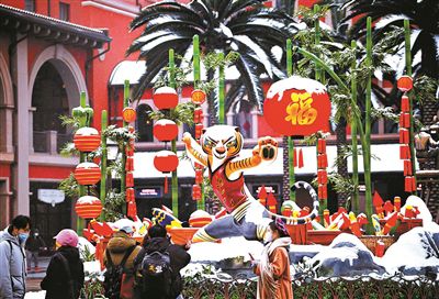 遍布園區(qū)的新春主題裝飾、全新推出的新春主題娛樂演出、充滿“年味”的限定美食……昨日,在紛紛揚(yáng)揚(yáng)的雪花中,北京環(huán)球度假區(qū)開啟了首個(gè)“環(huán)球中國年”季節(jié)性主題活動(dòng)。即日起至2月20日,帶有春節(jié)特色的全新娛樂體驗(yàn)將伴隨游客一起辭舊迎新,共同迎接虎年春節(jié)的到來。