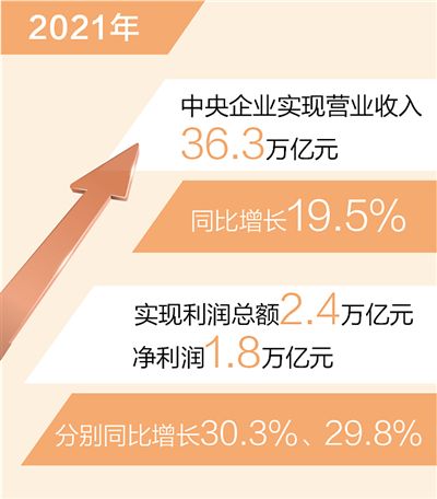 本報北京1月19日電 (記者劉志強)記者從國務(wù)院國資委了解到:去年中央企業(yè)經(jīng)營規(guī)模、經(jīng)濟效益和運行質(zhì)量保持穩(wěn)中向好、快中提質(zhì),為我國經(jīng)濟發(fā)展作出重要貢獻。2021年,中央企業(yè)實現(xiàn)營業(yè)收入36.3萬億元,同比增長19.5%,兩年平均增長8.2%;實現(xiàn)利潤總額2.4萬億元、凈利潤1.8萬億元,分別同比增長30.3%、29.8%,兩年平均增速分別為14.5%、15.3%。營業(yè)收入、利潤總額、凈利潤等主要指標均創(chuàng)歷史最好水平。