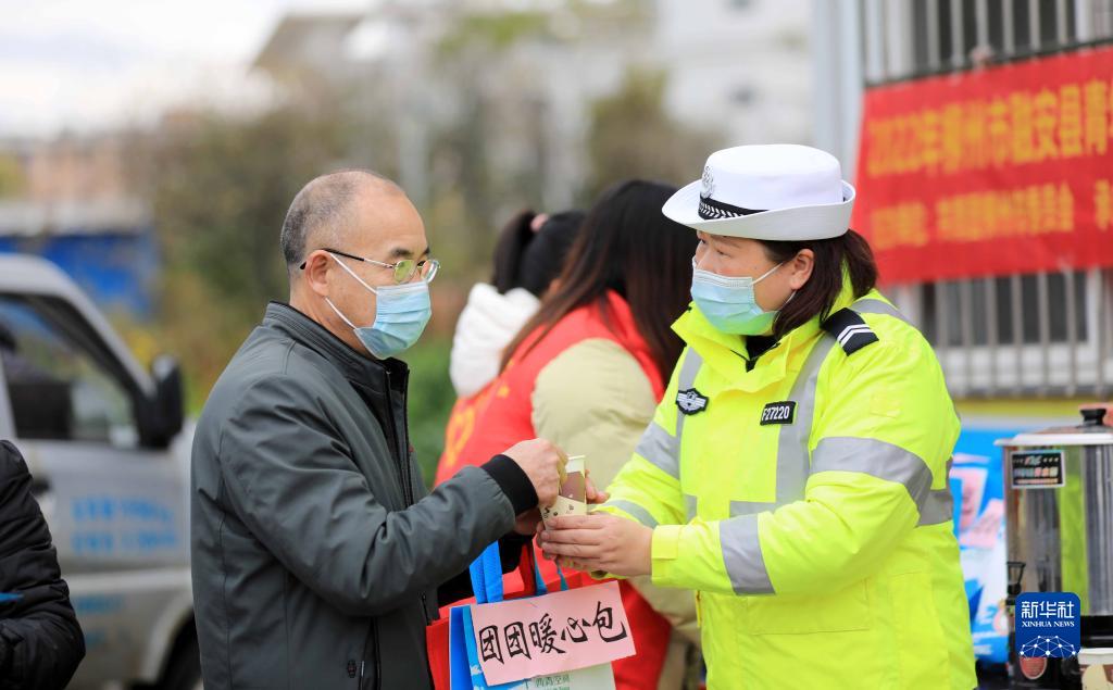 1月17日,在209國道廣西柳州市融安縣段“春運(yùn)愛心驛站”,交通輔警為司乘人員送姜糖茶。新華社發(fā)(譚克興攝)